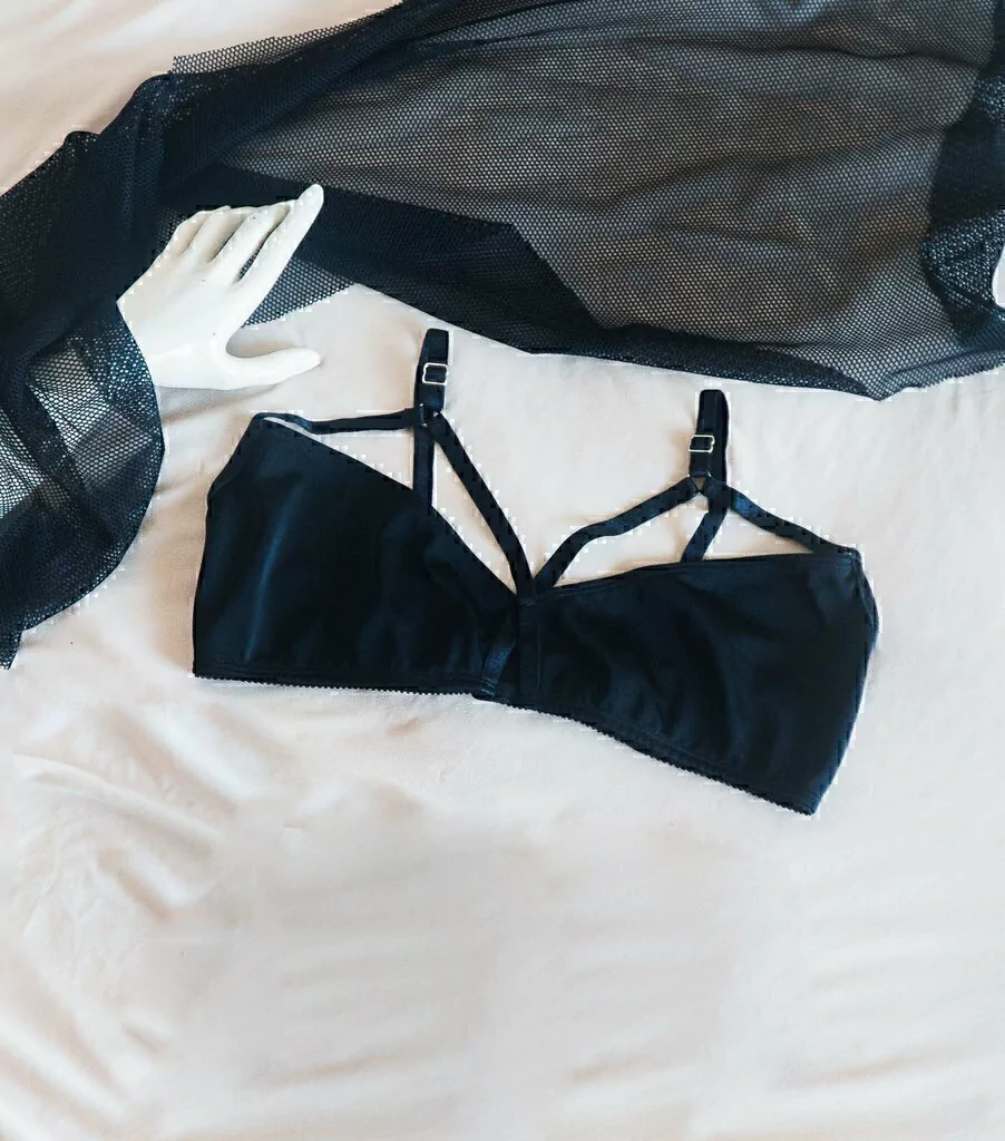 De lycra negra en la parte delantera, y en la parte posterior juego de elásticos negros semibrillantes cruzados, con arandelas y reguladores metálicos de acero inoxidable. Al tener reguladores los elásticos de esta prenda se adaptan a la forma de tu cuerpo.
